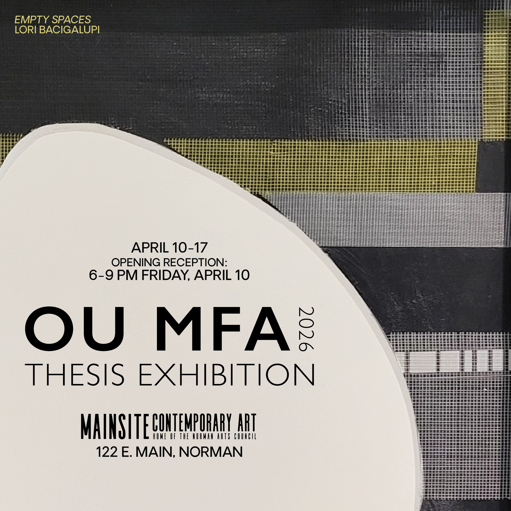 MAINSITE Contemporary Art — located at 122 E. Main, Norman — is open 10 am - 4 pm Tuesday through Saturday during exhibition windows. The gallery is closed to the public for changeover and installation between exhibitions.